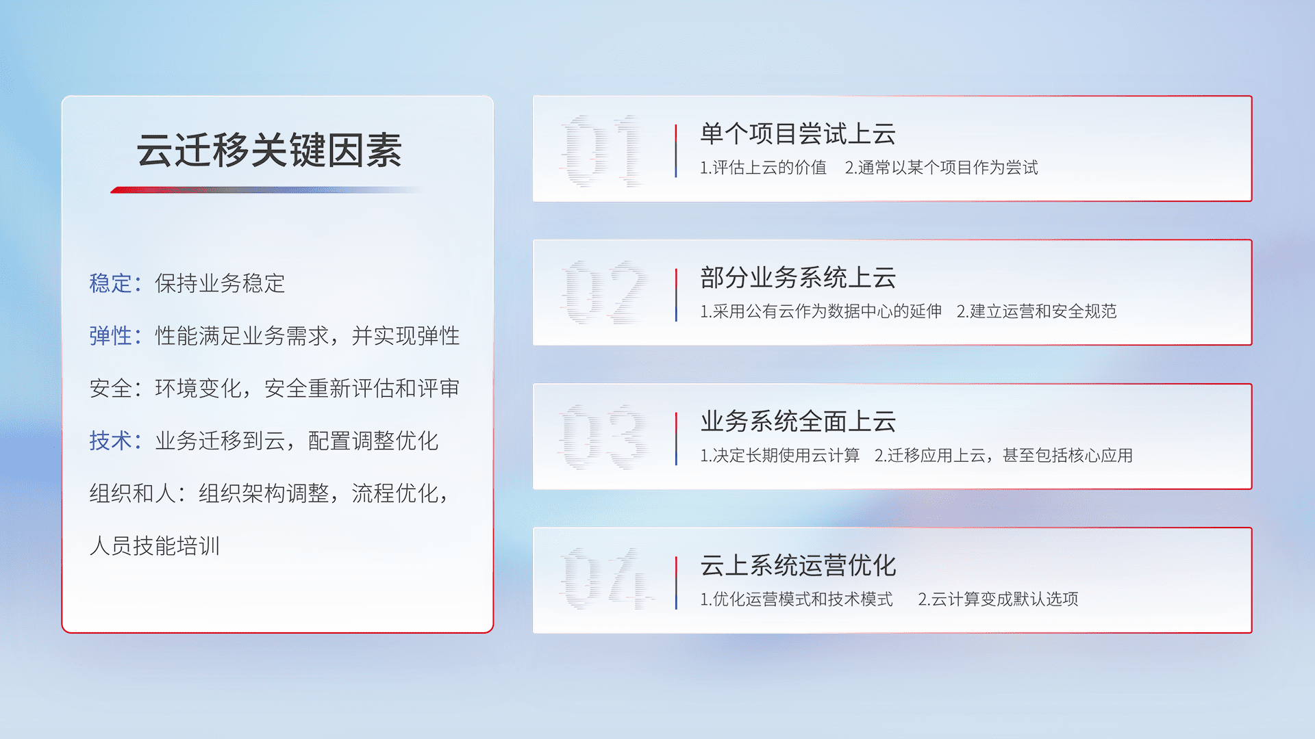 结合实际业务,,,,从规划设计、、云平台选型、、、、云原生改造、、、、数据迁移、、集成交付,,,,迁移全过程为客户识别最佳上云路径,,,,做好风险识别管理,,设计网络架构、、、、身份权限、、安全审计合规、、操作审计、、、、日志审计、、、监控告警策略、、多站点容灾设计等,,对云上基础设施进行整体规划,,,提升IT治理水平,,,,以满足弹性、、高可用、、、高性能的需求。。