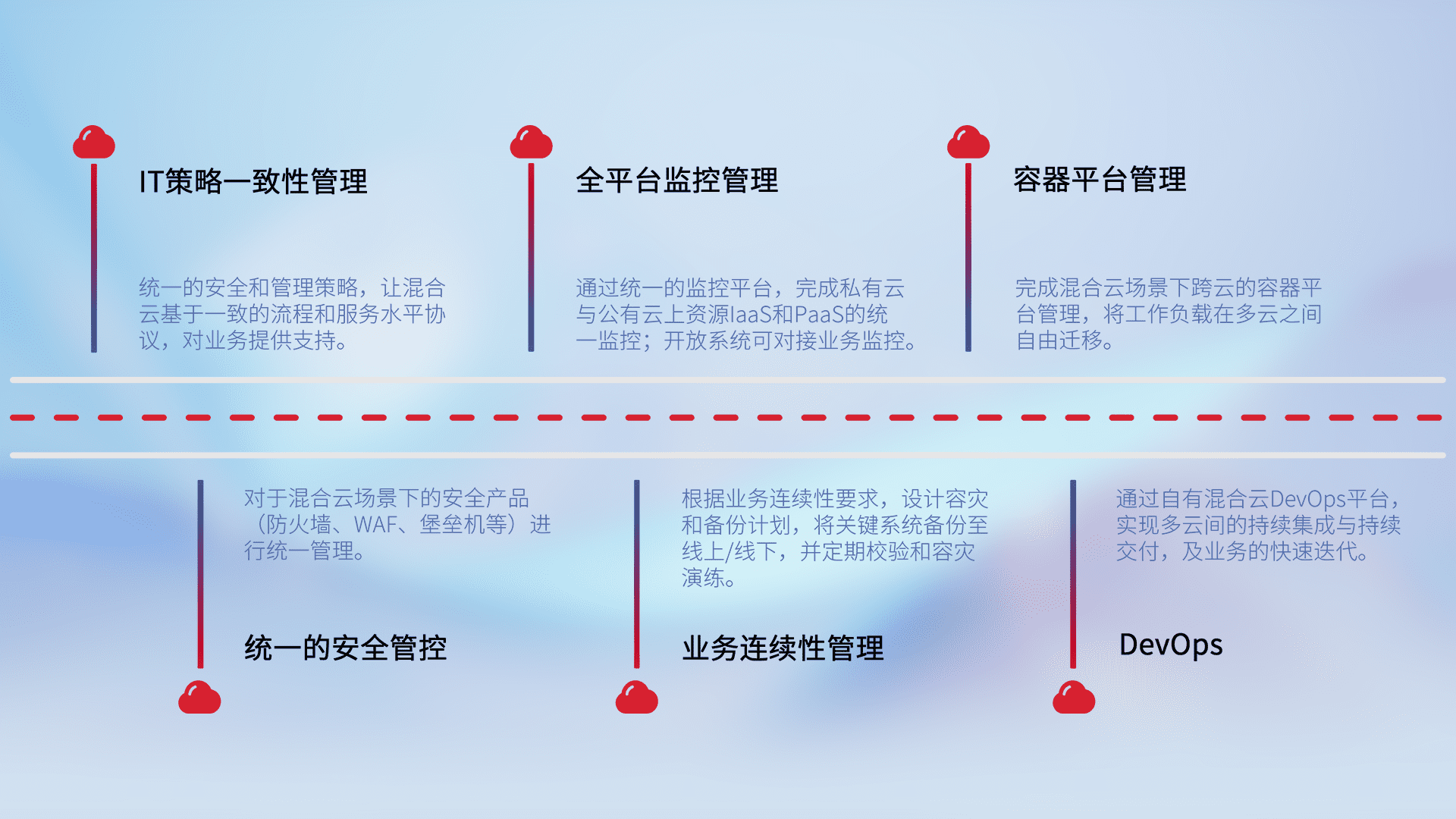 通过多云纳管,,,,以统一的资源数据模型把客户的云资源进行抽象和封装,,,,进而实现对多云资源的统一操作,,,,保障云资源管理的可靠性、、、稳定性与可用性。。。。量身定制化运维内容,,,配置、、、、开发运维、、、补丁管理、、备份、、、监控、、、、认证和访问管理、、、、审计和日常巡检等,,,,保障在用云过程中的可靠度,,,稳定度以及高可用率。。。。