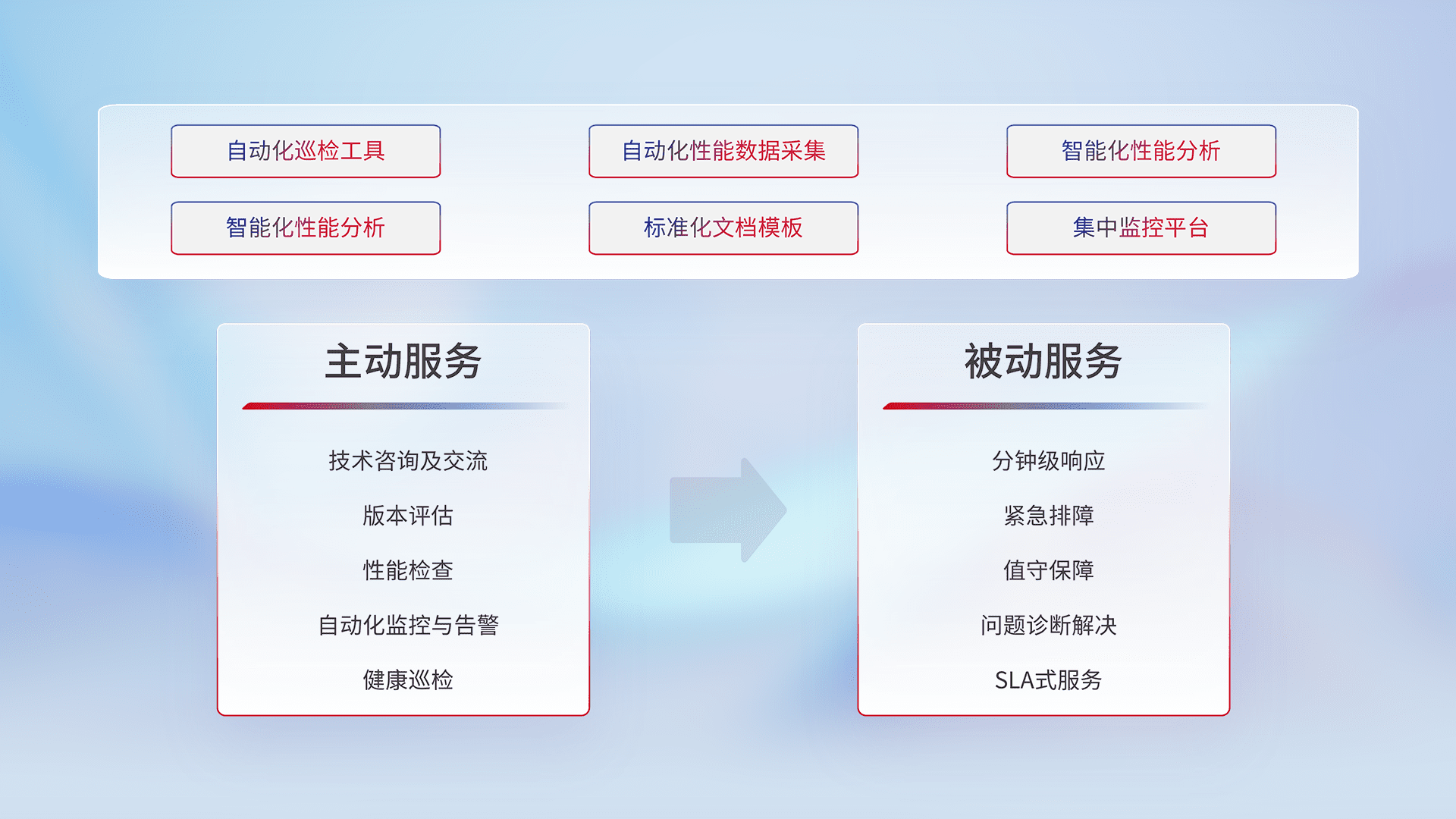 智能化工具和标准化文档,,,保障服务质量,,,提供主动服务(包含技术咨询、、、、版本评估、、、、性能检查、、、、自动化监控与告警、、、健康巡检)和被动服务包含(分钟级响应、、、紧急排障、、、值守保障、、、问题诊断解决、、、SLA服务)。。