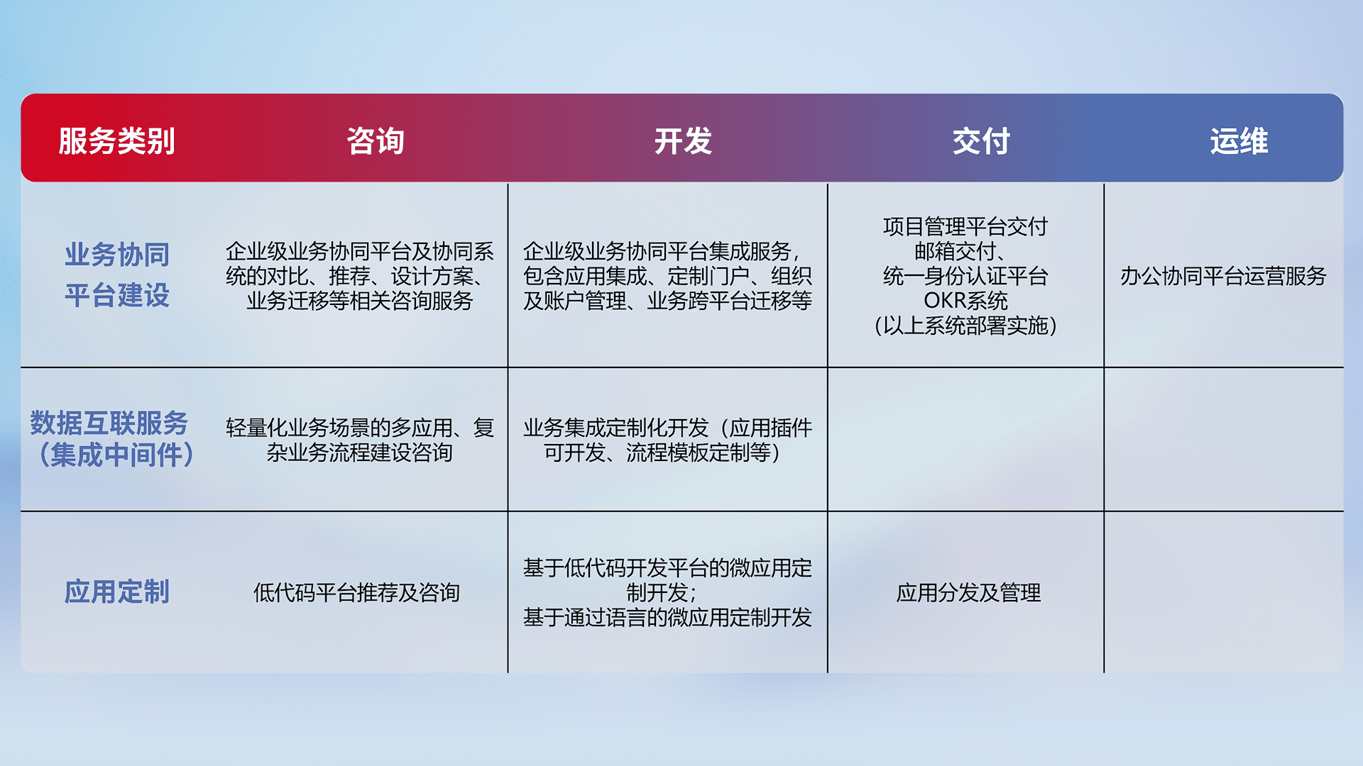 针对钉钉、、、、企微、、、IDaas等平台级产品提供产品的规划、、、方案、、、、交付、、、定制化开发等服务,,,,实现如统一协同办公、、、、智能客户服务、、、、混合会议管理、、、智能数据查询、、等业务场景,,,,实现数字化转型。。。